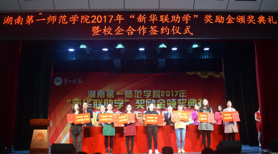 11月14日下午,湖南第一師范學(xué)院2017年“新華聯(lián)助學(xué)”獎(jiǎng)勵(lì)金頒獎(jiǎng)典禮暨校企合作簽約儀式在湖南一師實(shí)驗(yàn)劇場(chǎng)隆重舉行。新華聯(lián)集團(tuán)高級(jí)助理總裁、工會(huì)主席兼企業(yè)文化部總監(jiān)楊運(yùn)輝代表傅軍總裁,與湖南第一師范學(xué)院黨委書記彭小奇,校長(zhǎng)童小嬌,副校長(zhǎng)劉鴻翔、劉宇,為來自該校商學(xué)院、外國(guó)語(yǔ)學(xué)院、文學(xué)與新聞傳播學(xué)院、音樂舞蹈學(xué)院、美術(shù)與設(shè)計(jì)學(xué)院、信息科學(xué)與工程學(xué)院、教育科學(xué)學(xué)院等的陳美華、黃思佳、鄢雪梅等50名優(yōu)秀貧困大學(xué)生分別頒發(fā)新華聯(lián)助學(xué)獎(jiǎng)勵(lì)金10000元。