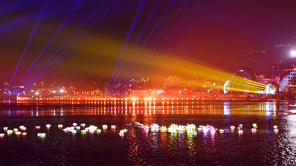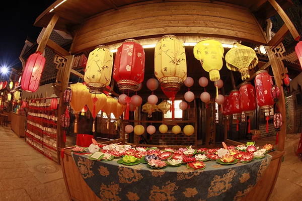 “中秋之夜”晚會(huì)以“天涯共此時(shí)”為主題,精心設(shè)置了主、副兩個(gè)舞臺(tái)。主舞臺(tái)以銅官窯古鎮(zhèn)水秀景觀為主體。波光粼粼的湖水、絢爛多彩的燈光、皎潔明亮的月色,恰到好處的倒影,共同營造出“水天一色,水月中秋”的詩情畫意。副舞臺(tái)設(shè)置在熱鬧的銅官美食街。街上有吹糖人、拉洋片、捏泥人等非物質(zhì)文化遺產(chǎn)項(xiàng)目以及舞火龍、手工月餅、花燈等中秋節(jié)傳統(tǒng)民俗,還原古人過中秋的情節(jié)。銅官窯古鎮(zhèn)優(yōu)美的意境、深厚的文化底蘊(yùn)與中秋佳節(jié)花好月圓人團(tuán)圓的氣氛完美融合,相得益彰。
