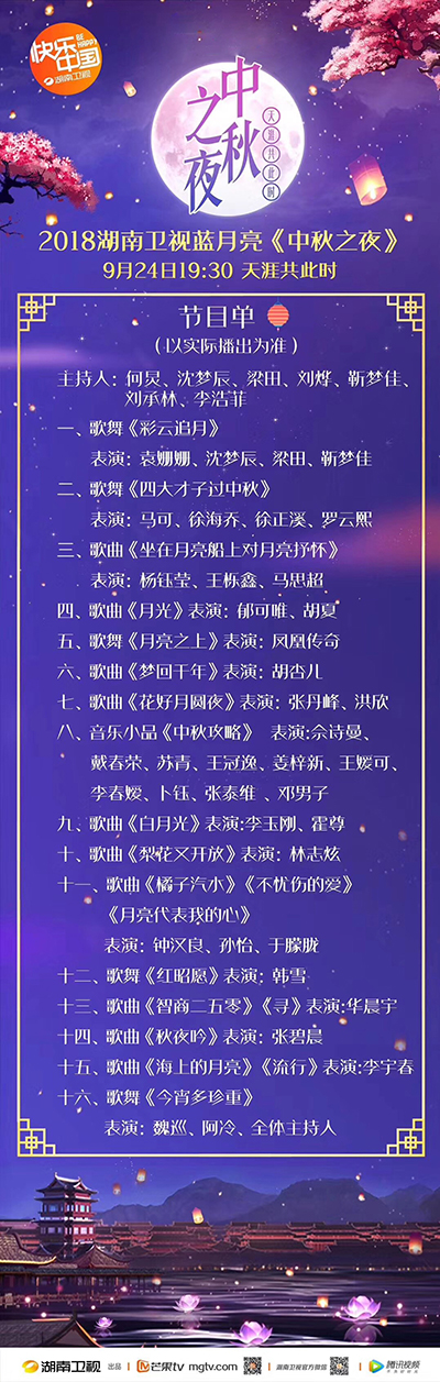 9月24日19:30,湖南衛(wèi)視2018中秋晚會(huì)精彩上演。今年的晚會(huì)全程在長沙新華聯(lián)銅官窯古鎮(zhèn)戶外實(shí)景錄制,李宇春、華晨宇、林志炫、佘詩曼、鐘漢良、韓雪、張碧晨、袁姍姍、羅云熙等明星大咖云集銅官窯古鎮(zhèn),與觀眾共度一個(gè)“星”光璀璨、亮點(diǎn)紛呈的“中秋之夜”。