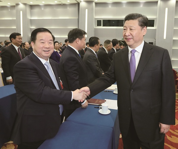 中國人民政治協商會議第十二屆全國委員會四次會議于2016年3月3—14日在北京召開。第十二屆全國政協委員、新華聯集團董事局主席兼總裁傅軍出席本次會議。會議期間,3月4日下午,習總書記來到工商聯聯組看望各位參會委員,與前排就坐的傅軍委員等親切握手,并參加了聯組討論。